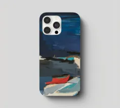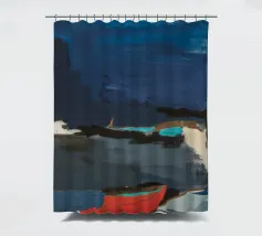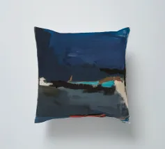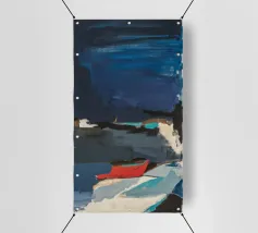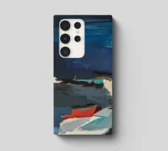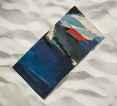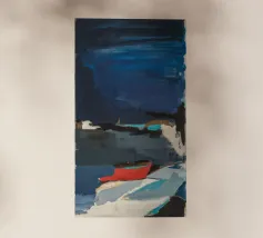 Un dipinto astratto minimalista caratterizzato da un campo dominante di blu profondo e sereno con un sottile bianco e accenni di arancione/marrone, disposto in una composizione prevalentemente orizzontale che suggerisce un orizzonte tranquillo.