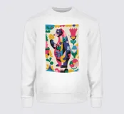 Un orso colorato in piedi tra vari fiori e piante astratte. L'orso è raffigurato in modo stilizzato con forme geometriche e colori vivaci.