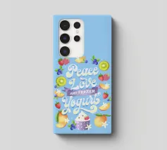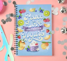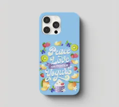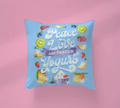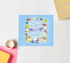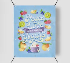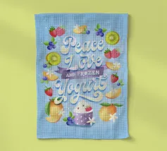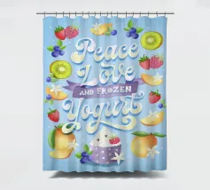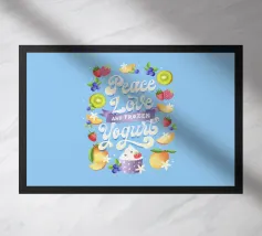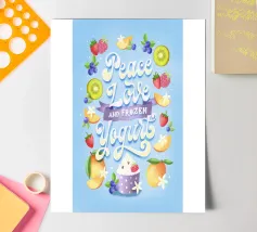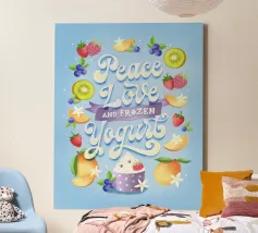 Una citazione divertente con tanta frutta disegnata a mano per la cucina o la zona pranzo. Pace, amore e yogurt gelato. Un motivo tipografico davvero unico. Le lettere sono disegnate a mano e colorate con i freschi e rinfrescanti colori del gelato. La cornice è formata da frutti come mirtilli, kiwi, fragole, mango, lamponi e fiori di vaniglia. È anche un disegno molto bello e adatto per un dolce caffè, per una gelateria, per un grazioso bistrot o ristorante.