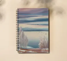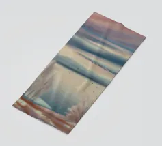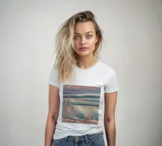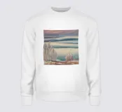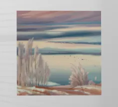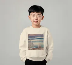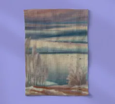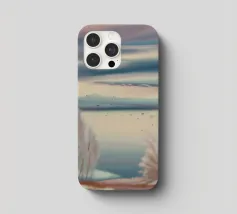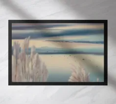 Morbide erbe costeggiano un lago pastello sotto un cielo delicatamente striato, catturando una sognante immobilità della costa.