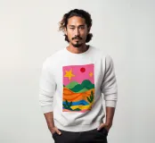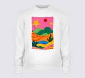 Illustrazione di un paesaggio vivace e fantasioso sotto un cielo rosa con un sole rosso e stelle gialle. Le dolci colline verdi e arancioni sono caratterizzate da un fiume arcobaleno colorato, che crea una scena gioiosa e onirica.