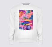 Un paesaggio astratto psichedelico e vibrante, pieno di forme vorticose e di sfumature colorate di rosa, arancione e blu. L'opera d'arte è una fuga onirica ed energica in un mondo di colori puri e movimento fluido.