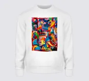 Un paesaggio surreale pieno di figure astratte, animali e forme geometriche. L'uso dinamico di colori vivaci e disegni intricati evoca immaginazione e curiosità.