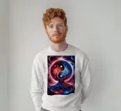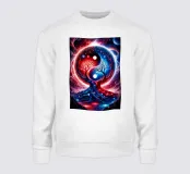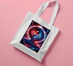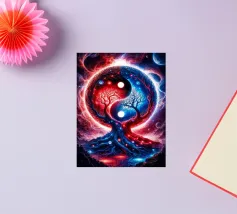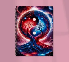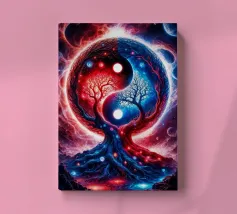 Una vibrante opera d'arte digitale raffigura un grande albero con rami intrecciati che formano un simbolo yin yang. L'albero è circondato da una nebulosa vorticosa di tonalità rosse e blu, con piccoli pianeti e stelle sparsi. Il simbolo yin yang è diviso in due metà, una rossa e una blu, ognuna delle quali rappresenta un diverso aspetto dell'universo.