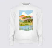 Raffigura un paesaggio tranquillo con uno specchio d'acqua in primo piano. Erbe alte e canne costeggiano l'acqua. Al centro, alberi dal tronco rosato e dal fogliame verde. Lo sfondo è caratterizzato da colline ondulate nei toni dell'arancione, del giallo e del verde, con un cielo blu e nuvole bianche in alto.