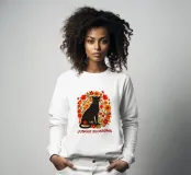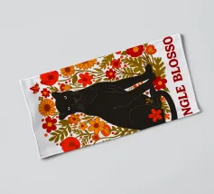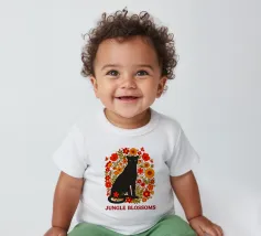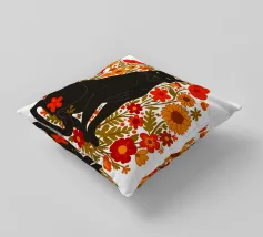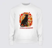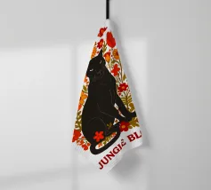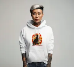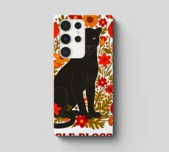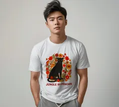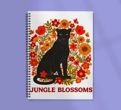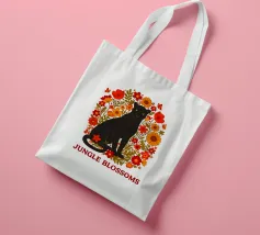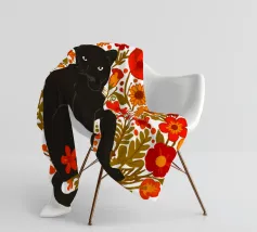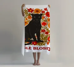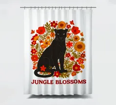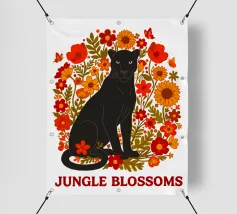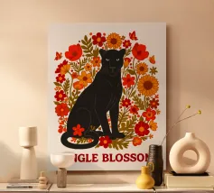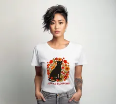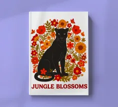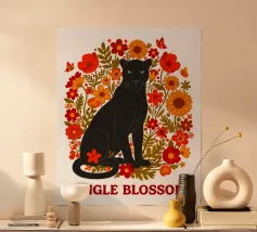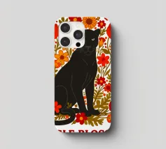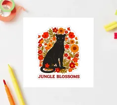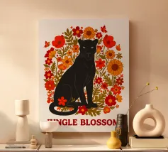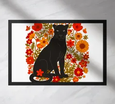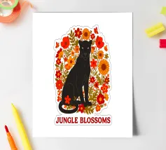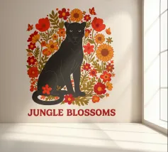 Sagoma di pantera nera circondata da fiori arancioni e rossi. Tavolozza calda, motivo floreale caratteristico; ideale per progetti audaci, tessuti grafici e accessori.
