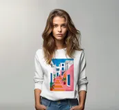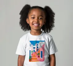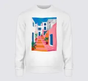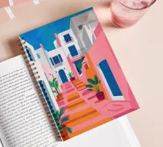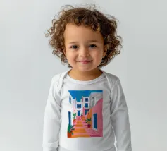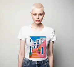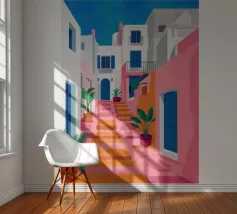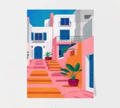 Una vivace illustrazione di una strada a gradini fiancheggiata da edifici colorati nei toni del rosa e del blu, caratteristici di una città mediterranea. La scena è luminosa, allegra e piena di fascino estivo.