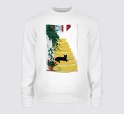 Un gatto nero siede su una serie di gradini gialli che conducono a un edificio con piante rampicanti. La composizione è una scena suggestiva, elegante e leggermente misteriosa di un luogo bellissimo e caldo.