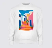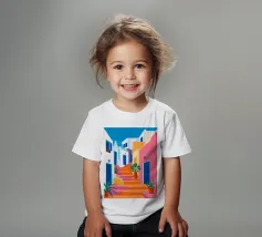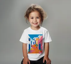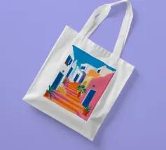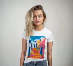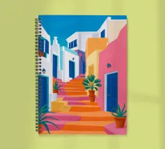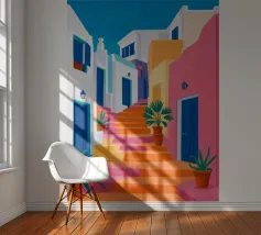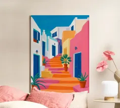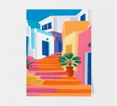 Un'illustrazione di un'affascinante scena di strada in una città mediterranea, con vivaci gradini rosa che salgono oltre una porta blu brillante. I colori vivaci e l'architettura semplice creano un'immagine gioiosa, solare e pittoresca.