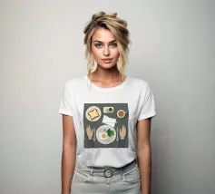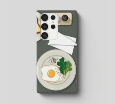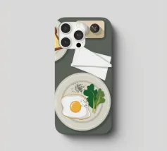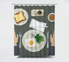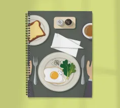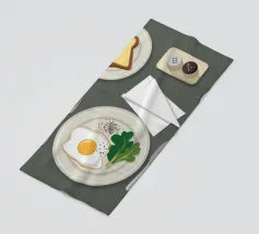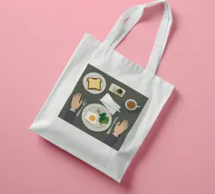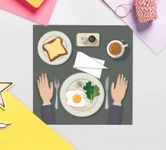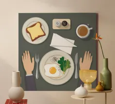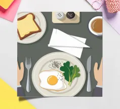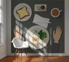 Questa illustrazione dall'alto verso il basso presenta una scena di colazione minimalista: un uovo fritto, una fetta di pane tostato e una tazza di caffè. Lo stile grafico pulito e la composizione organizzata creano un senso di calma e ordine, celebrando il semplice rituale del pasto mattutino.
