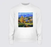 Un pittoresco paesaggio autunnale che raffigura un villaggio o una fattoria adagiata su una collina, circondata da un mosaico di alberi colorati nei toni dell'arancione e del giallo e da campi coltivati, con le lontane montagne blu a completare la scena.