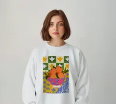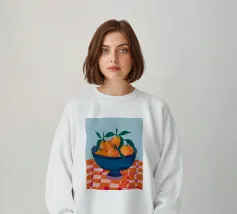 Le arance mandarine in una ciotola di vetro su un panno a motivi geometrici combinano freschezza e audacia.