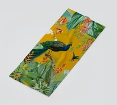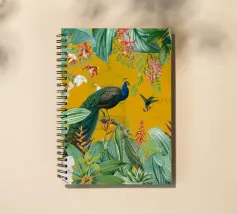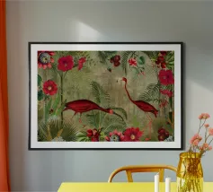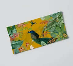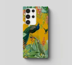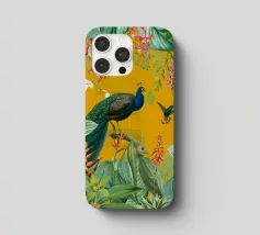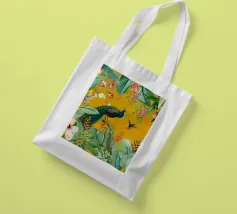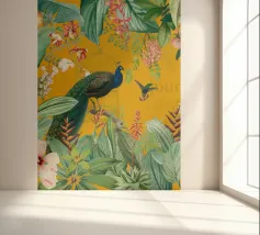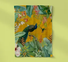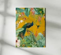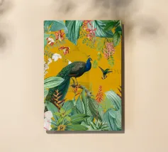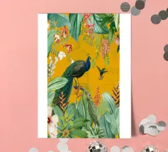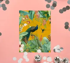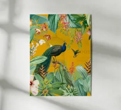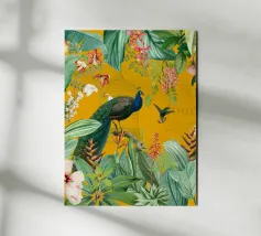 Questo collage vintage cattura l'eleganza dei tropici con una splendida composizione di lussureggianti foglie tropicali e frutti vivaci. Al centro, due splendidi pavoni si ergono con grazia, con le loro piume iridescenti che brillano nei toni del blu, del verde e dell'oro. Il maestoso piumaggio dei pavoni contrasta con il ricco fogliame, aggiungendo un senso di raffinata bellezza. Le sottili texture vintage dello sfondo esaltano l'eleganza generale, mentre i colori vibranti delle foglie e dei frutti danno vita alla scena, evocando un paradiso esotico senza tempo.
