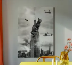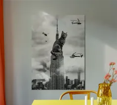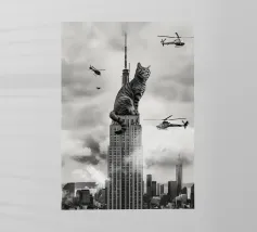 "Questo collage surreale trasporta lo spettatore in una scena iconica con una svolta inaspettata: un gattino gigante appollaiato in cima all'Empire State Building di New York. In un chiaro omaggio al classico film di King Kong, il felino sovrasta la città con un mix di dolcezza e potenza. La combinazione tra l'imponenza del grattacielo e l'innocenza del gattino crea un'immagine tanto assurda quanto affascinante, trasformando una scena tesa in una parodia visiva che fa sorridere e accende l'immaginazione".