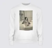 Un pulcino di pinguino è circondato da soffici bolle mentre è seduto in una vasca da bagno. L'ambientazione del bagno e l'atmosfera giocosa creano una scena affascinante e stravagante.