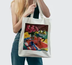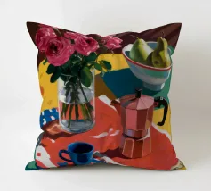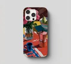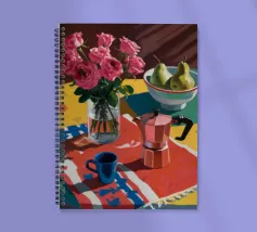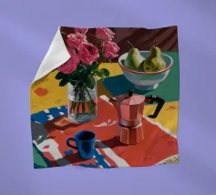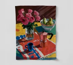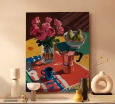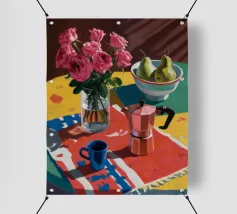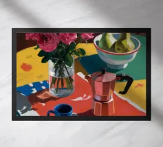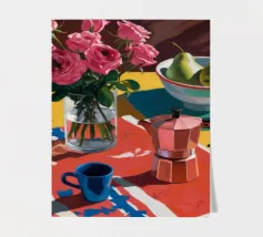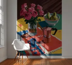 Un'affascinante natura morta con peonie rosa in un vaso di rame, una brocca blu e una ciotola di pere. La scena è ambientata su una tovaglia a fantasia su uno sfondo rosso, creando un'atmosfera calda, eclettica e invitante.