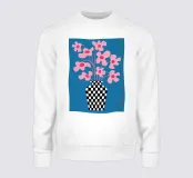 Un'illustrazione audace e grafica di un bouquet di semplici fiori rosa in un sorprendente vaso a scacchi bianchi e neri. L'alto contrasto e le forme semplici creano un pezzo moderno e giocoso con un forte impatto visivo.