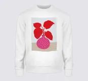 Una pianta rossa stilizzata si trova in un eccentrico vaso rosa ornato da pois blu, creando un'illustrazione botanica divertente, giocosa e altamente stilizzata.