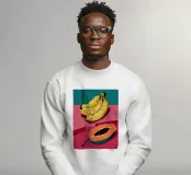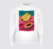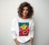Un'illustrazione audace e ispirata alla pop art di banane e papaya su un piatto rosso brillante. I colori ad alto contrasto e lo stile grafico creano una dichiarazione vibrante e giocosa.