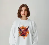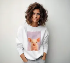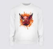 Un'illustrazione giocosa di un volto di maiale sorridente su un vivace sfondo arancione. I colori vivaci e lo stile da cartone animato creano un design vivace e allegro, perfetto per progetti creativi o concetti a tema agricolo.