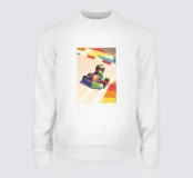 Illustrazione di un colorato pilota di go-kart in pista con uno stile geometrico moderno.