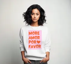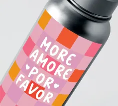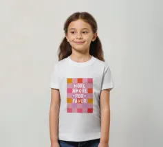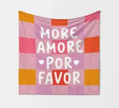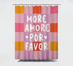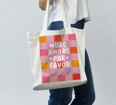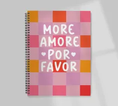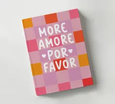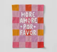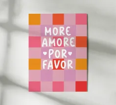 Il moderno poster di testo con la scritta "More Amore Por Favor" combina grandi lettere giocose in caratteri bianchi su un vivace sfondo a scacchiera. I colori rosa, bianco, arancione e rosa conferiscono al disegno un'allegra atmosfera estiva, ispirata all'Italia. Questo design grafico a motivi irradia amore e gioia di vivere.