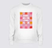 Il moderno poster di testo con la scritta "More Amore Por Favor" combina grandi lettere giocose in caratteri bianchi su un vivace sfondo a scacchiera. I colori rosa, bianco, arancione e rosa conferiscono al disegno un'allegra atmosfera estiva, ispirata all'Italia. Questo design grafico a motivi irradia amore e gioia di vivere.