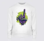 Illustrazione a fumetti colorata e dettagliata di una mano di zombie con vivaci tonalità verdi e viola, texture gocciolanti e dito indice esteso. La mano è collocata su uno sfondo verde brillante per un effetto spettrale.