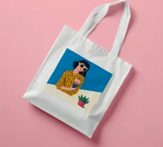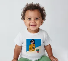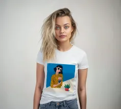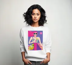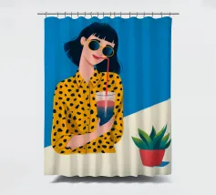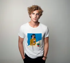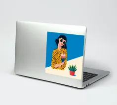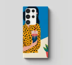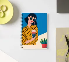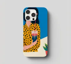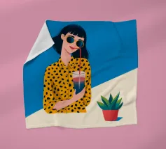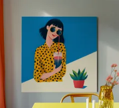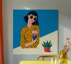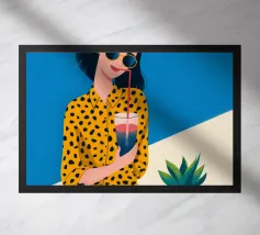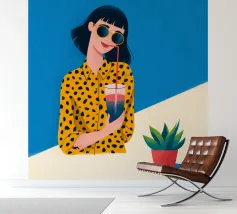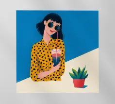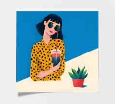 Una scena fresca e rilassata con una persona con una camicia gialla a pois che tiene in mano una bevanda con una cannuccia. Lo sfondo blu brillante e la pianta in vaso esaltano l'atmosfera fresca.