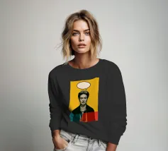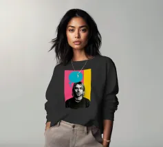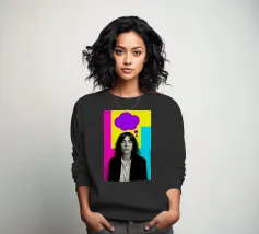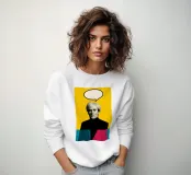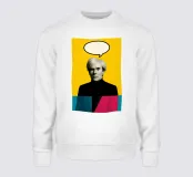 Andy Warhol, il re della pop art, in un omaggio con un colpo di scena: una bolla vocale vuota fluttua sopra la sua testa - su uno sfondo giallo brillante, combinato con allusioni colorate CMYK in ciano, magenta e nero. Tra ritratto, pop e post-ironia. Fa parte della serie Geometric Masters, che decostruisce figure artistiche iconiche utilizzando forme e colori geometrici. Forte, intelligente, moderno.