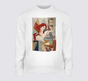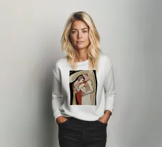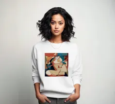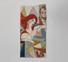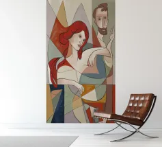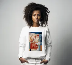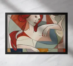 Questa opera d'arte mostra una donna in una posa aggraziata, circondata da forme e colori astratti. La composizione evidenzia l'eleganza e la fluidità della figura.