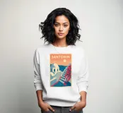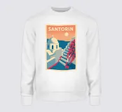 Questo poster vintage di Santorini illustra il fascino unico dell'isola greca con le sue case bianche, la cupola blu e le bouganville in fiore sul bordo del Mar Egeo. Un poster mediterraneo luminoso che invita al viaggio e al relax.