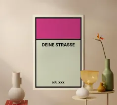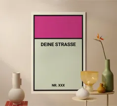 Un classico rivisitato: questo poster personalizzabile con l'aspetto delle leggendarie strade del Monopoly porta divertimento e personalità alla vostra parete. Con la strada preferita e il numero civico individuale, è un originale richiamo visivo, sia come regalo di benvenuto, sia per la prima casa o semplicemente come divertente dichiarazione per la vostra casa. Ideale per gli appassionati di videogiochi, per le famiglie o per le pareti di un appartamento. Disegnate subito online e decorate con umorismo!