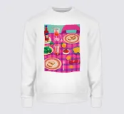 Un'illustrazione vivace e leggermente distorta di un piatto da pranzo su una tovaglia a scacchi rosa e viola, con una bevanda rinfrescante, che crea un'atmosfera divertente ed energica.
