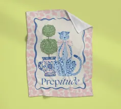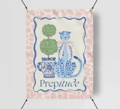 Leopardo blu con fiocco accanto a un buxus. Elevate il vostro spazio con questa atmosfera preppy.