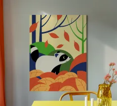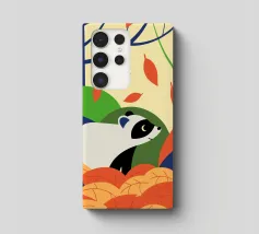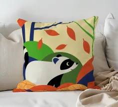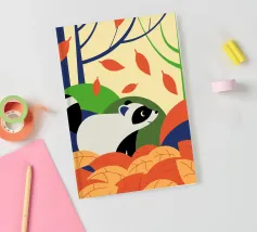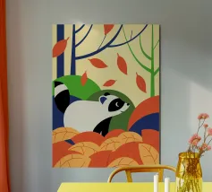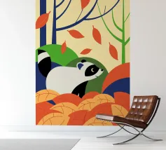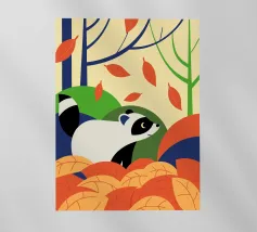 Godetevi una vivace illustrazione naturalistica con un procione in una scena autunnale con foglie che cadono.