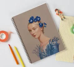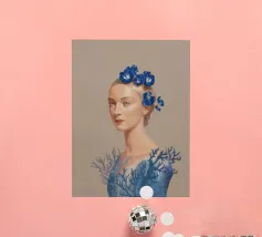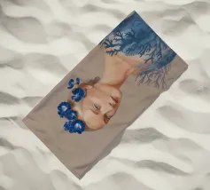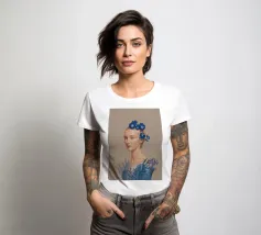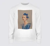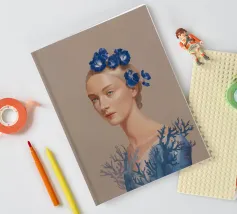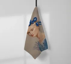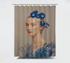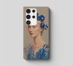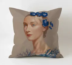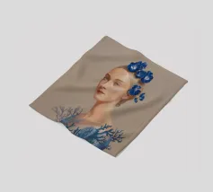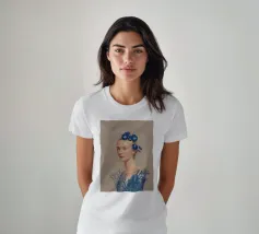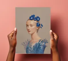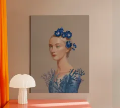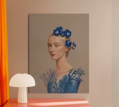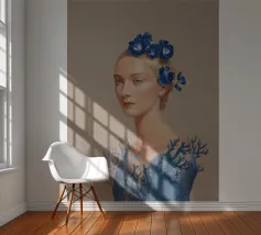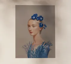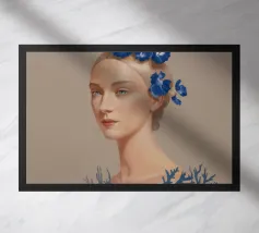 Delicato ritratto di profilo di una donna dalla pelle chiara e dai capelli chiari ornati di fiori blu, che indossa un abito blu strutturato che fa pensare a piume o a un tessuto morbido.