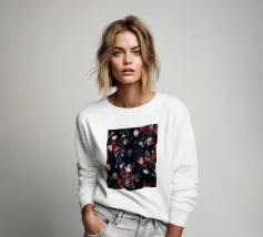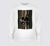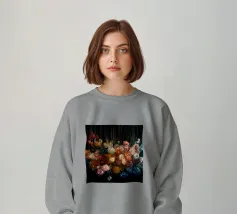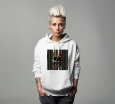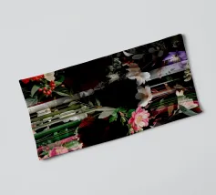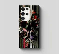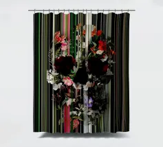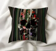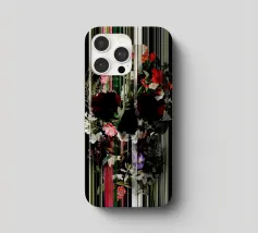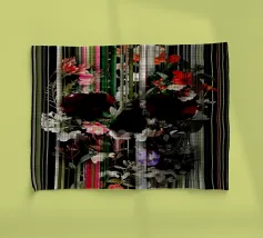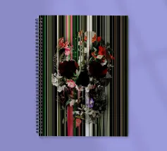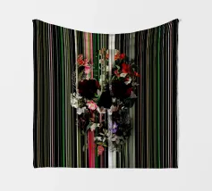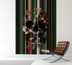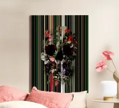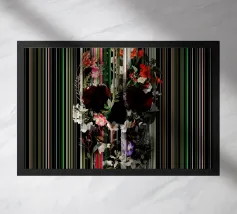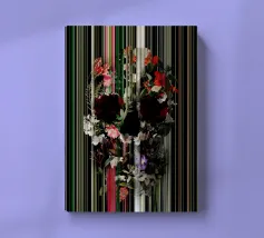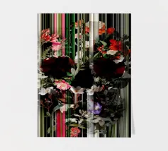 Un bouquet delicato con un tocco dark. Questa opera d'arte rivela un teschio formato interamente da fiori e fogliame lussureggianti, che galleggia su uno sfondo nero profondo. Bande verticali di colore verde neon, rosa arrossato, crema e bianco attraversano l'opera come glitch digitali, squarciando i fiori e conferendo al disegno un'atmosfera moderna, quasi olografica.