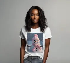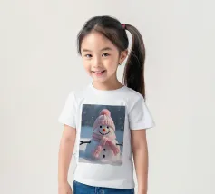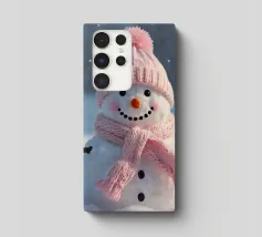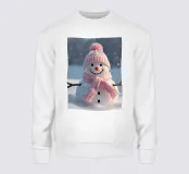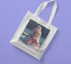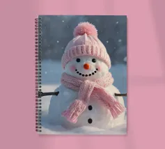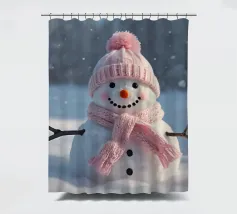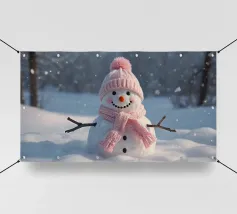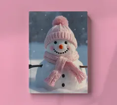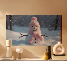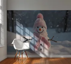 Un allegro pupazzo di neve con cappello e sciarpa rosa sorride tra i fiocchi di neve che cadono in un tranquillo paesaggio invernale. Gli alberi circostanti aggiungono fascino alla stagione.