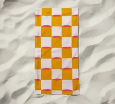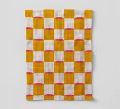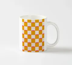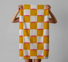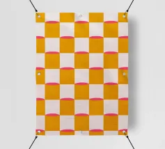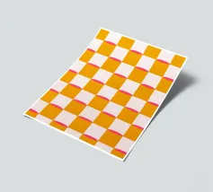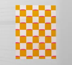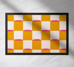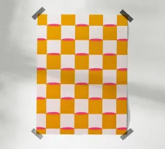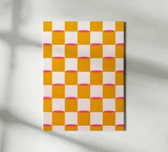 Questo vivace quadro astratto combina un motivo a scacchiera in giallo senape, rosa e bianco con forme geometriche per creare un'atmosfera creativa e moderna. I colori vivaci e gli elementi minimalisti rendono quest'opera d'arte di grande effetto in qualsiasi stanza.