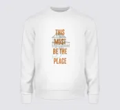 Un poster tipografico colorato con il testo This Must be the Place in giallo su sfondo beige. L'arte murale colorata è la scelta perfetta per ravvivare la vostra casa.