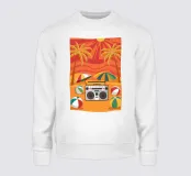 Vista dall'alto di una coperta da spiaggia con una radio vintage, un pallone da spiaggia e occhiali da sole. La scena è divertente, nostalgica e perfetta per rappresentare una classica e spensierata giornata in spiaggia.