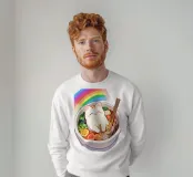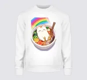 Adorabile gatto bianco comodamente seduto in una ciotola di ramen, circondato da uno stravagante arcobaleno.