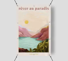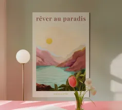 Incantevole vista mediterranea sul mare. I colori estivi sono piacevoli e caldi e danno un'immediata sensazione di estate. In lontananza ci sono bellissime linee d'arte e in primo piano una foresta con palme. I colori estivi sono meravigliosamente caldi e danno subito un'impressione di paradiso. Immaginatevi su un'isola tropicale! Il poster è stato progettato come manifesto per una mostra, nella serie estiva: couleurs d'été.