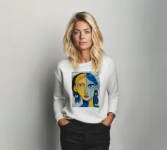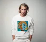 Questo dipinto presenta una figura dai capelli dorati e dalla pelle blu. La natura astratta dell'opera crea un senso di riflessione e introspezione.