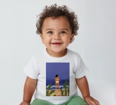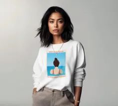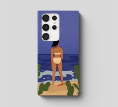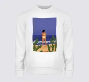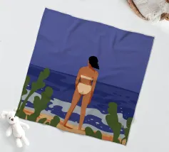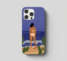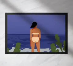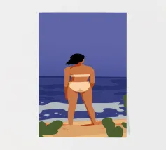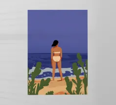 Una donna in bikini bianco si trova sul bordo della spiaggia e guarda il mare al crepuscolo, circondata da una vegetazione lussureggiante.