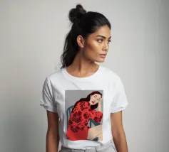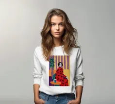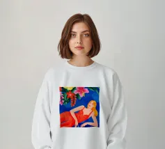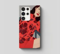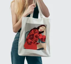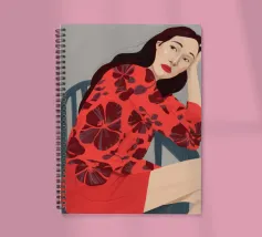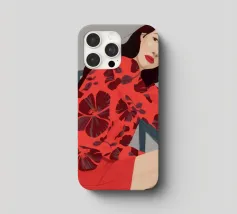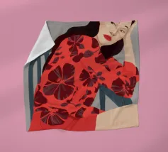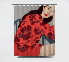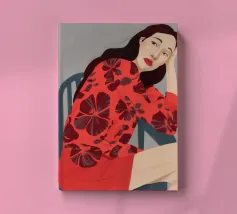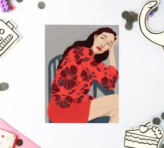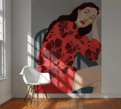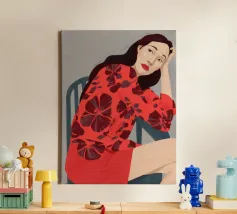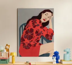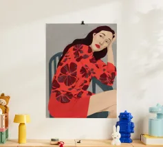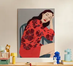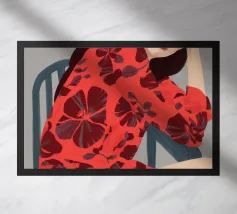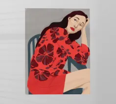 Il dipinto raffigura una figura in abito rosso con motivi floreali, seduta in una posa riflessiva. Lo sfondo è semplice e sottolinea l'atmosfera introspettiva della scena.