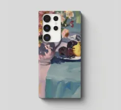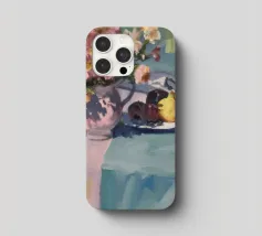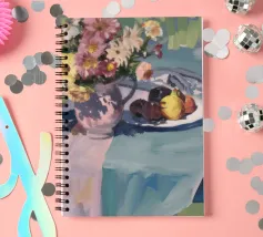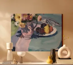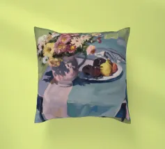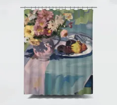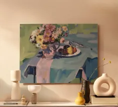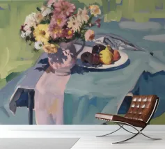 Un'affascinante natura morta con una ciotola di fiori vivaci e dai toni terrosi, probabilmente dalie o zinnie, accanto a un piatto con prugne scure e un delicato pasticcino, il tutto disposto su un tavolo grigio-blu tenue, che suggerisce un rustico dolcetto mattutino.