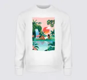 Una donna riposa vicino a una cascata in un vivace ambiente tropicale. Le palme, i fiori radiosi e il tramonto luminoso creano un santuario mozzafiato.