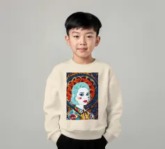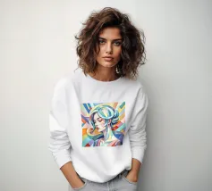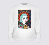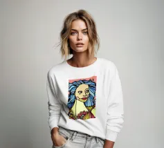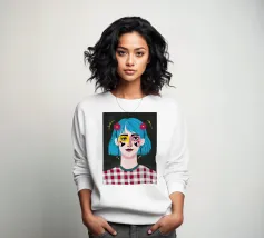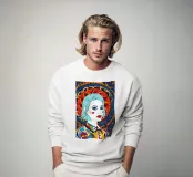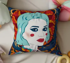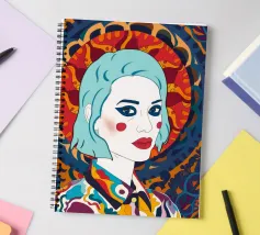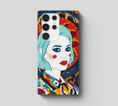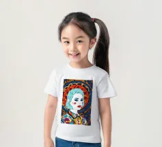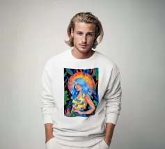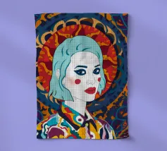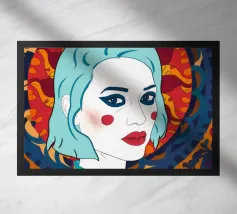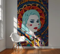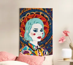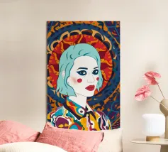 Questa opera d'arte mostra una figura con capelli blu circondata da intricati motivi caleidoscopici dai colori intensi. Lo sfondo è pieno di forme geometriche e disegni vivaci.